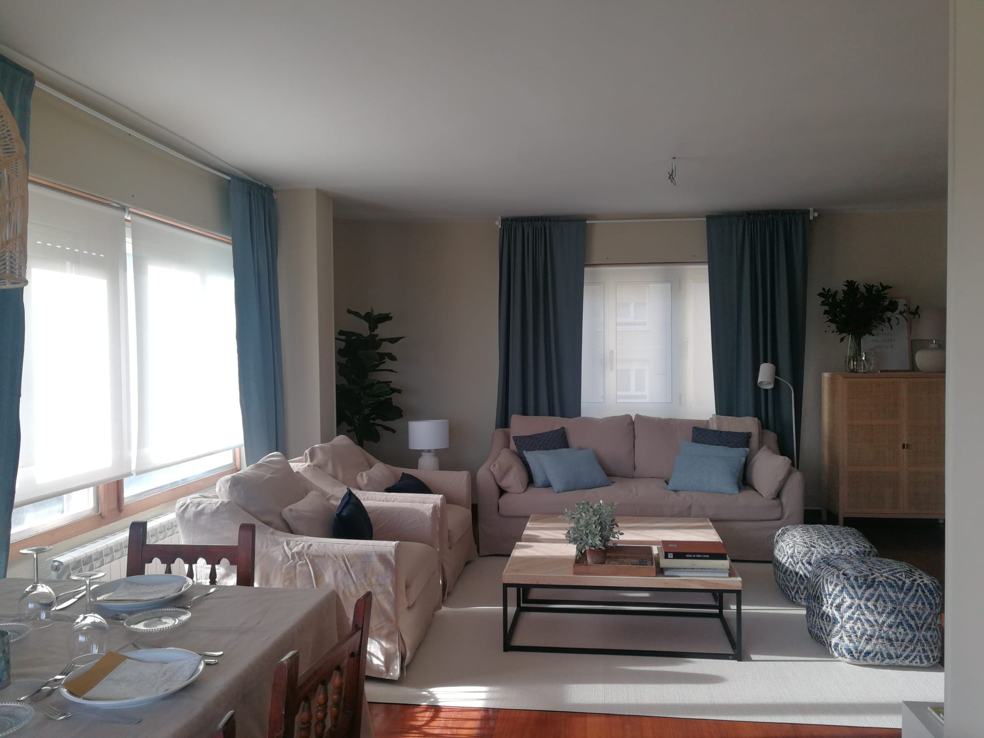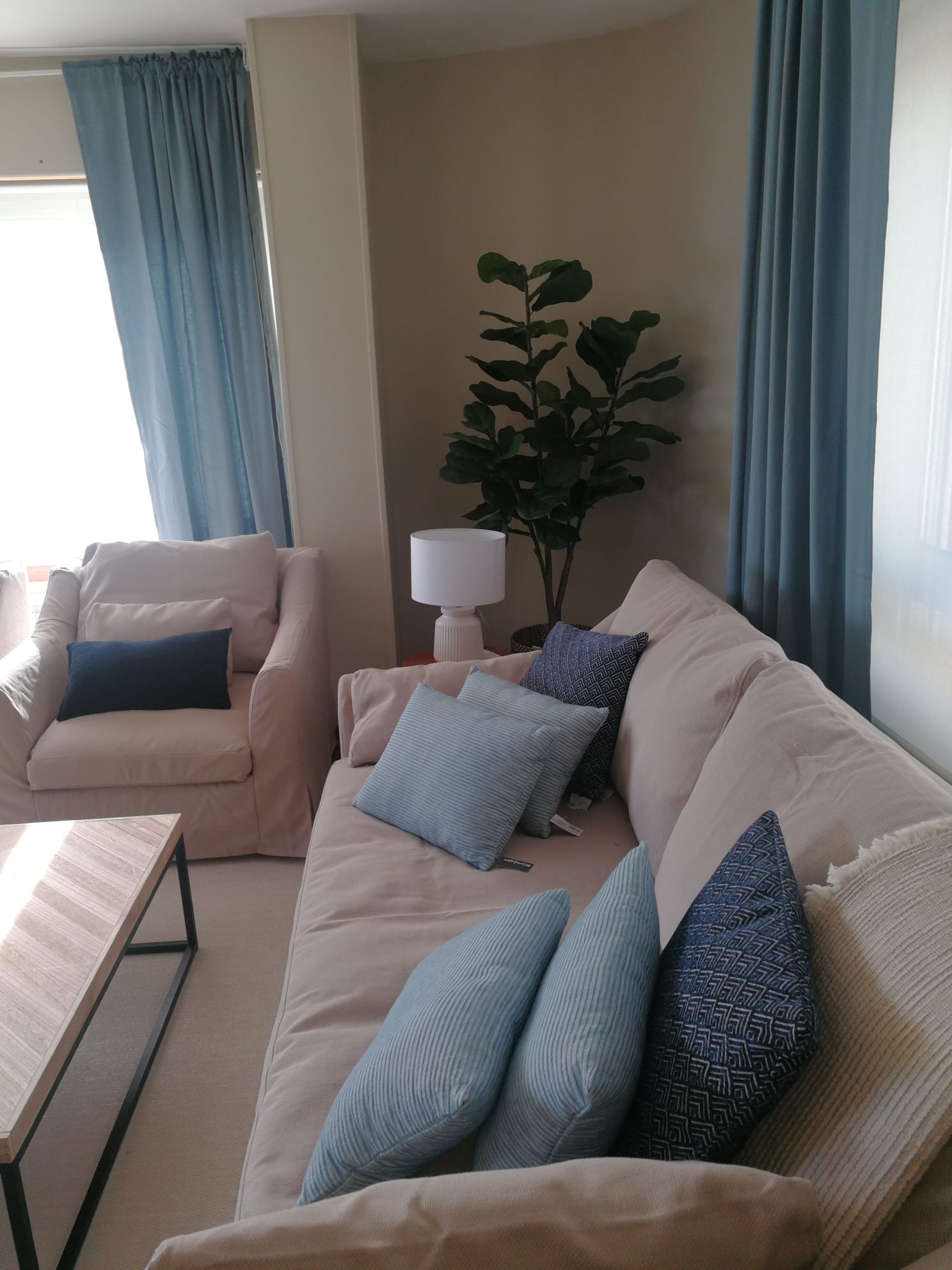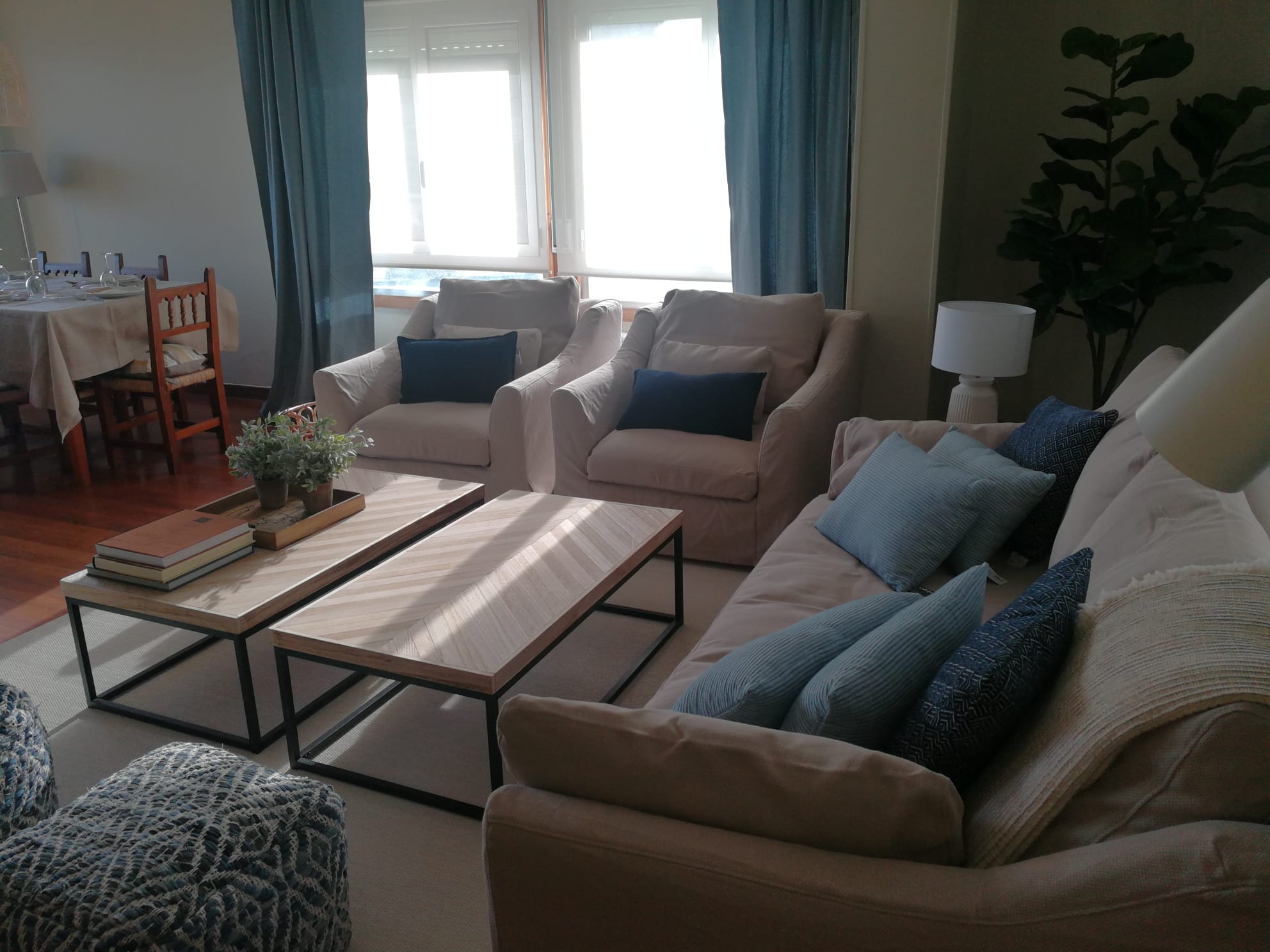 La elección de la paleta de colores fue clave en la transformación de este espacio. Se optó por tonos azul y beige, inspirados en los colores del mar y la arena. Esta combinación no solo aporta una sensación de calma, sino que también conecta el interior de la casa con el entorno natural exterior. Estos tonos suaves y serenos fueron aplicados en paredes, cortinas y cojines, creando una atmósfera relajante que invita al descanso y la contemplación.