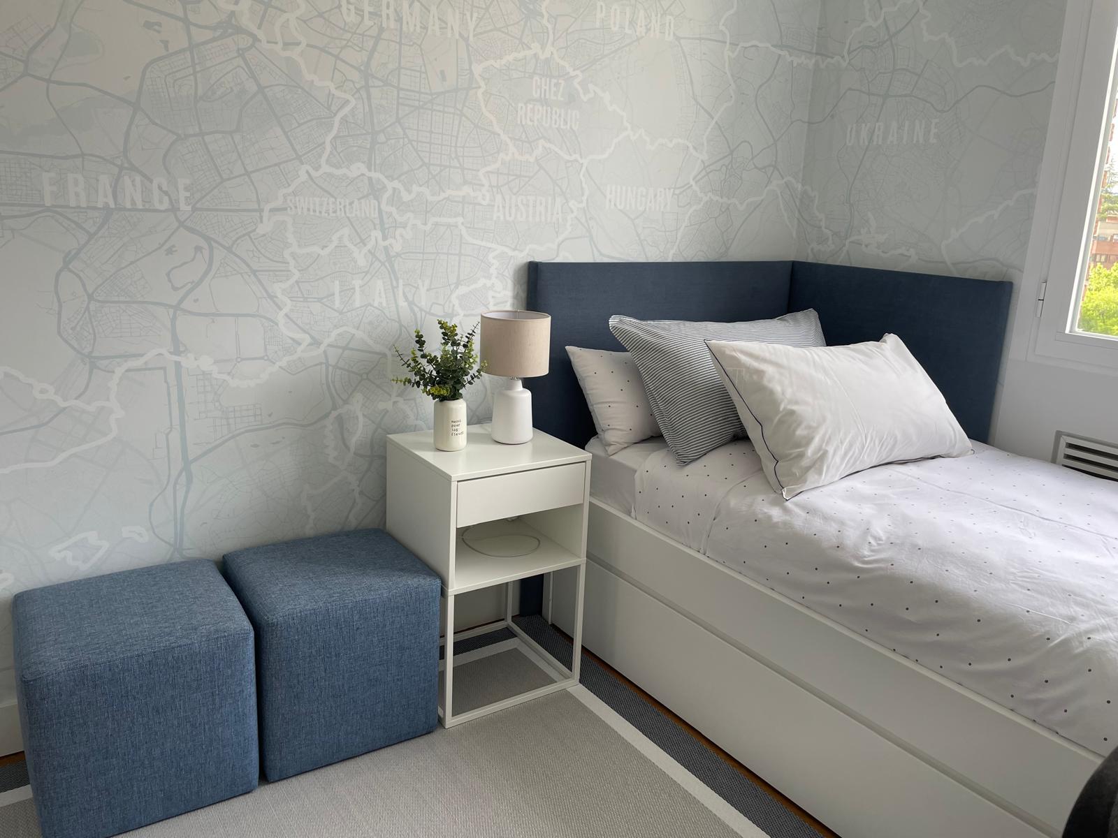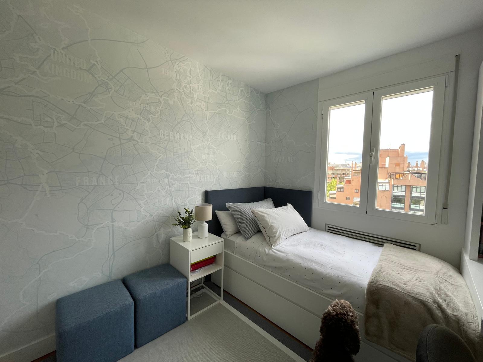 Una de las características más destacadas de esta habitación es el papel pintado personalizado. En lugar de optar por un diseño estándar, creamos un mapamundi que no solo aporta un toque educativo, sino que también tiene un significado especial para la familia. Se hizo hincapié en la zona de Francia, país de origen de parte de la familia, lo que convierte el papel pintado en algo más que una decoración: es un recordatorio visual de las raíces familiares.