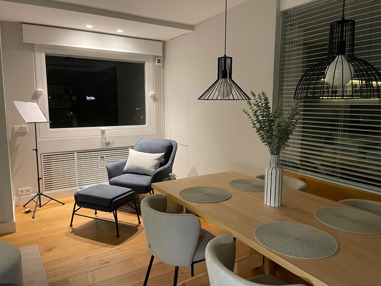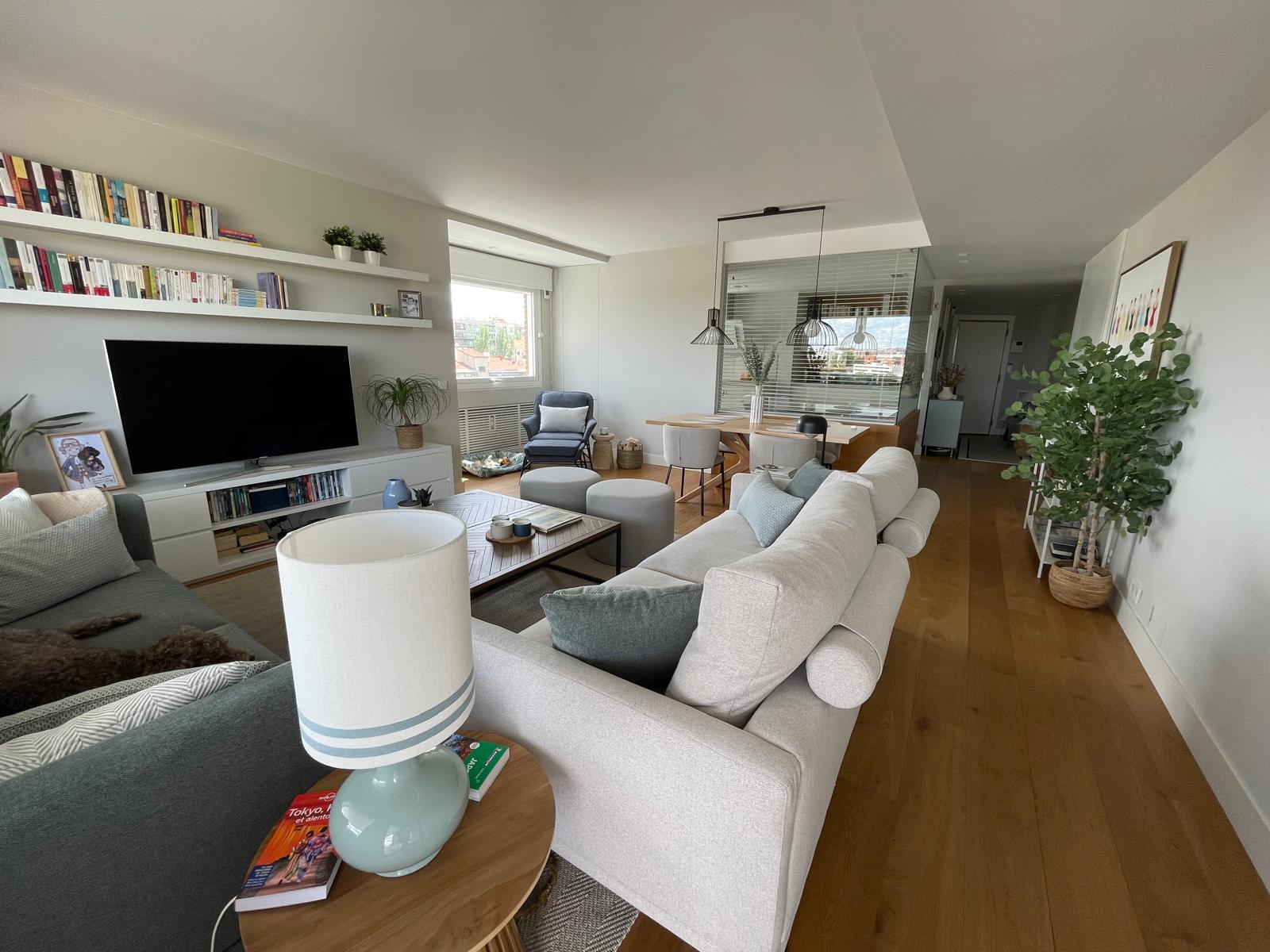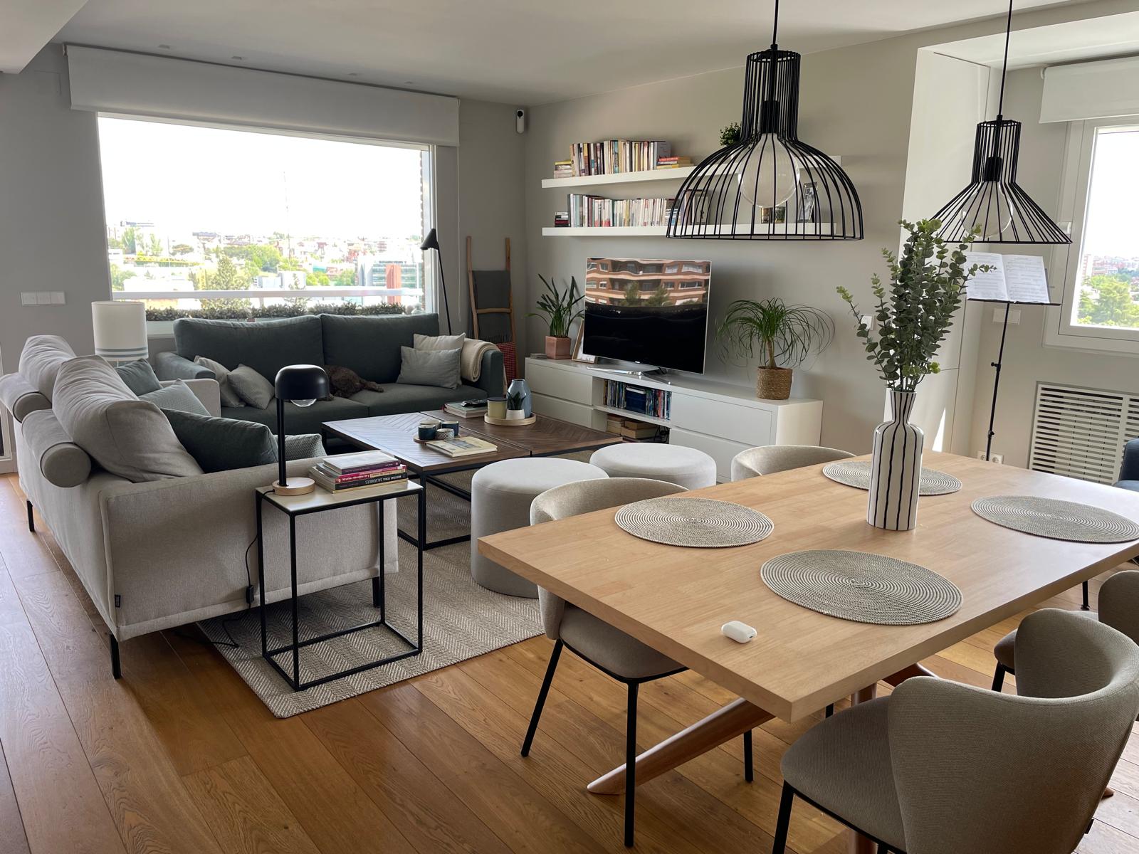 El salón se compone ahora de zona de TV y reunión, zona de lectura y relax junto a las vistas del pirulí, zona de comedor pegada a la cocina donde se sacaron puntos de luz y se complementó con librerías a suelo, lámparas con distintas funciones y sobre todo una ubicación de un aparador de entra y una consola frente a la mesa de comedor que cortan la vista del pasillo y lo hacen más agradable.