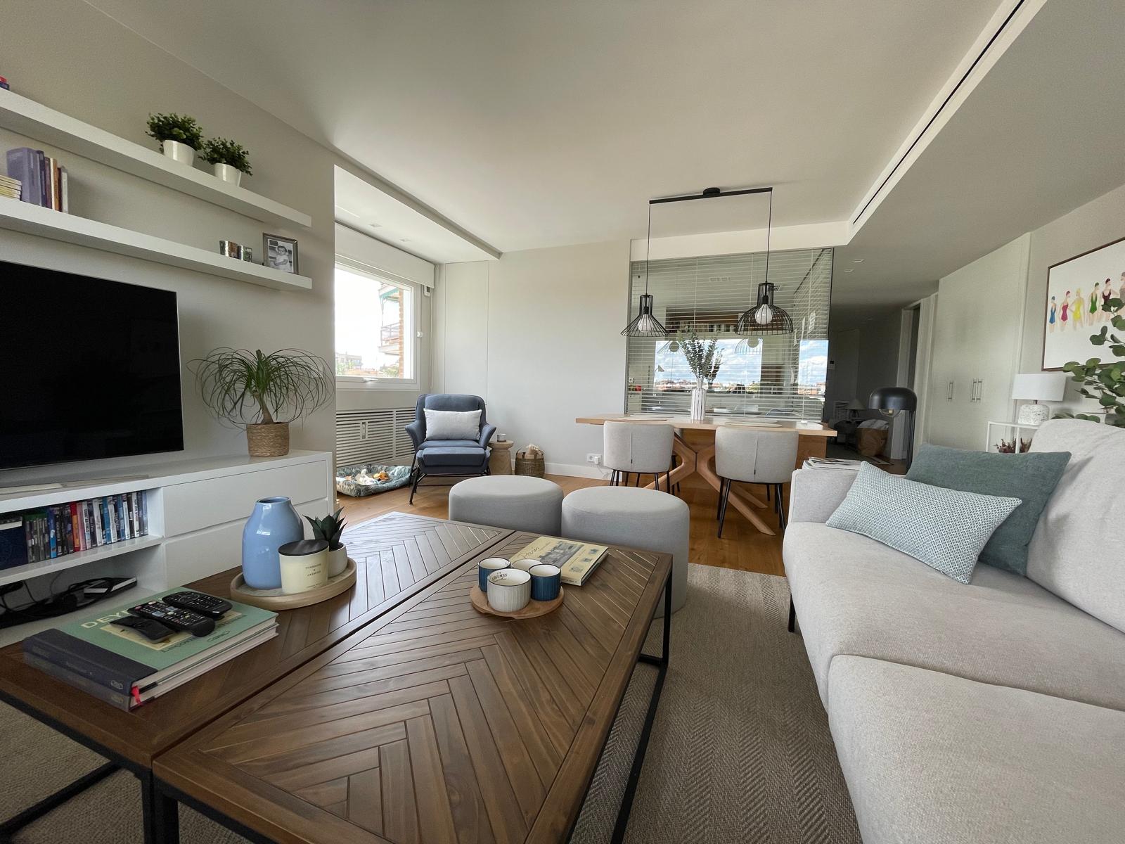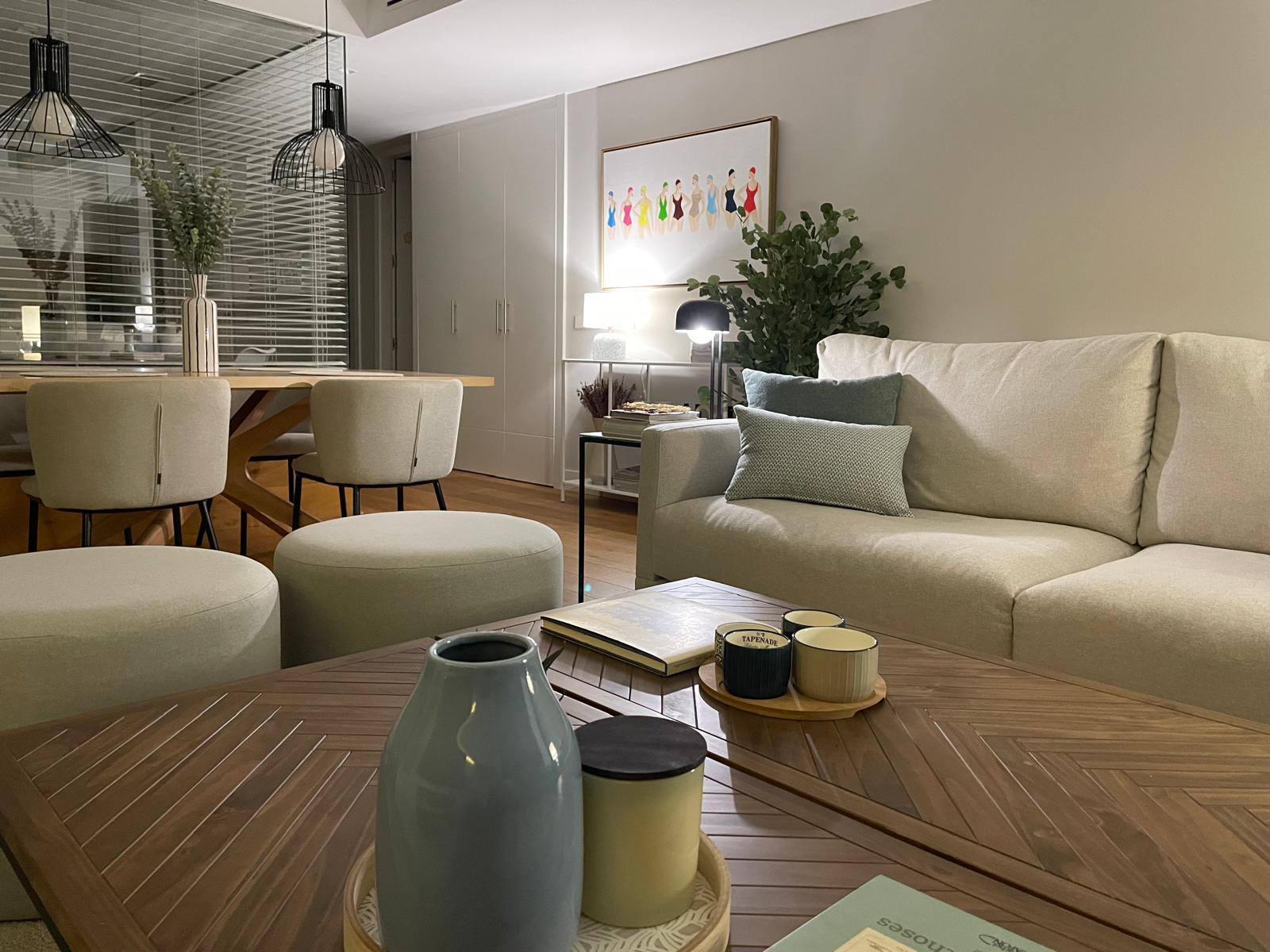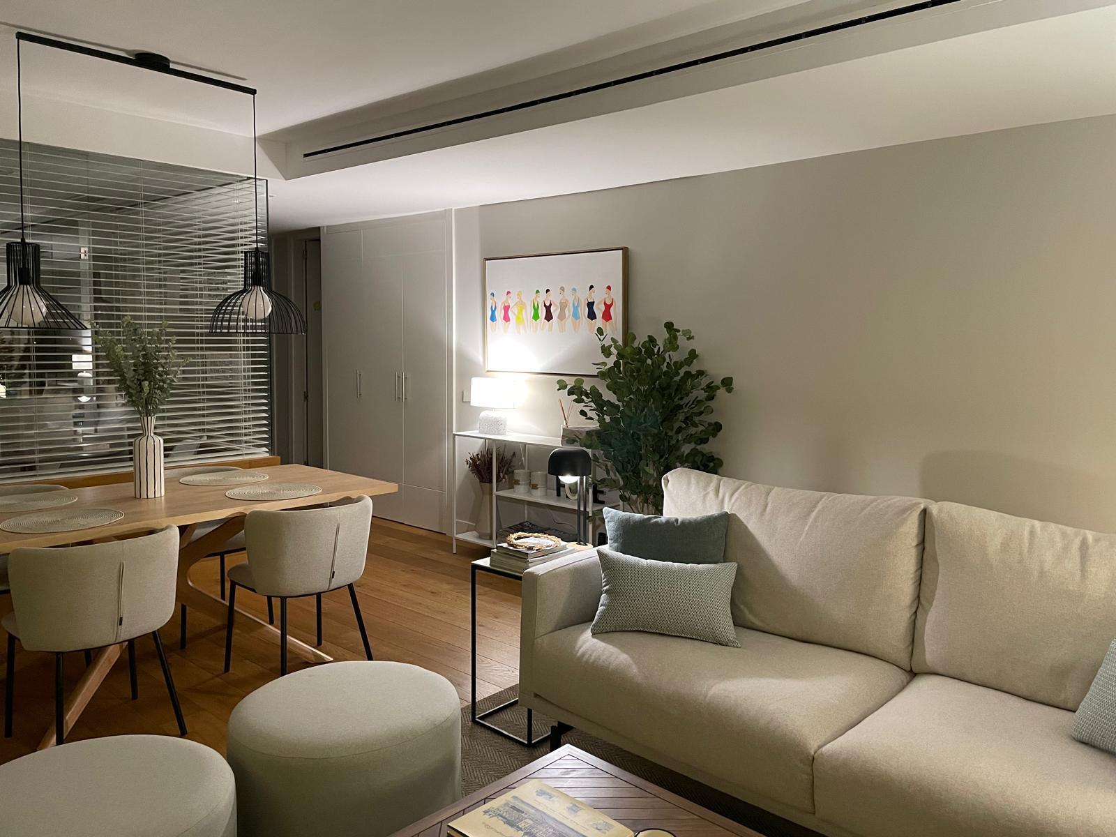 El salón se compone ahora de zona de TV y reunión, zona de lectura y relax junto a las vistas del pirulí, zona de comedor pegada a la cocina donde se sacaron puntos de luz y se complementó con librerías a suelo, lámparas con distintas funciones y sobre todo una ubicación de un aparador de entra y una consola frente a la mesa de comedor que cortan la vista del pasillo y lo hacen más agradable.
