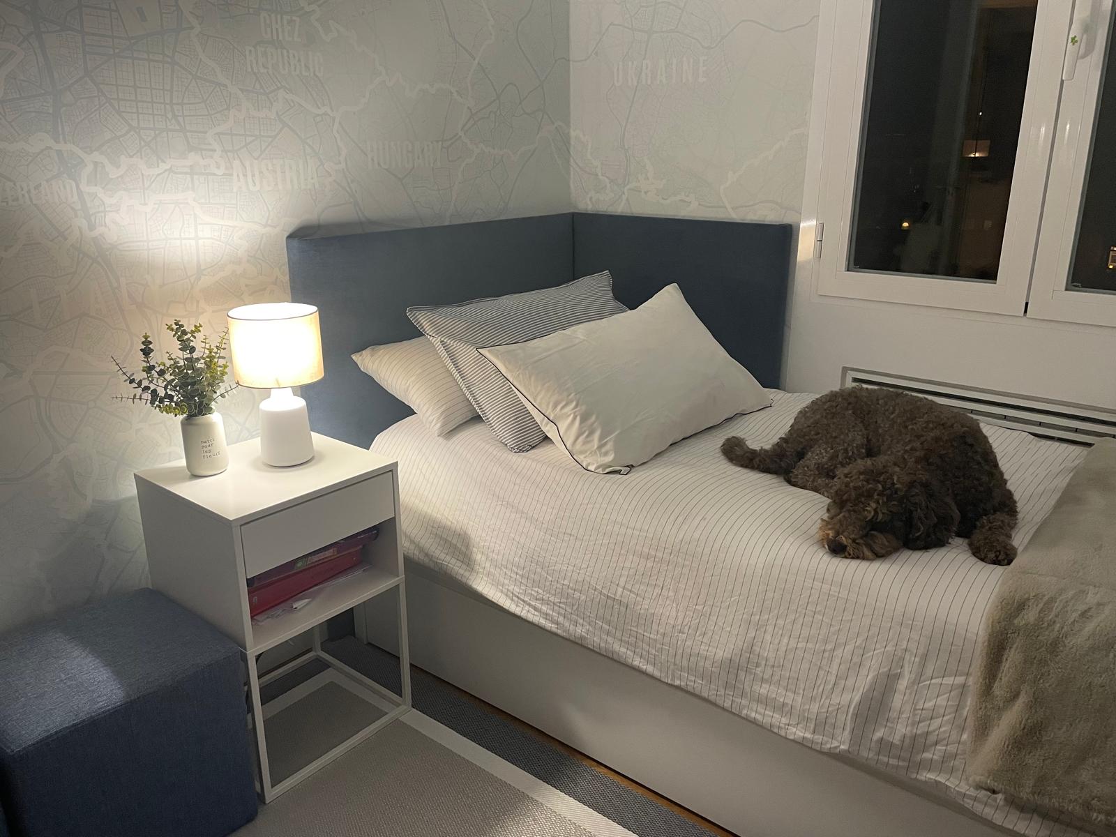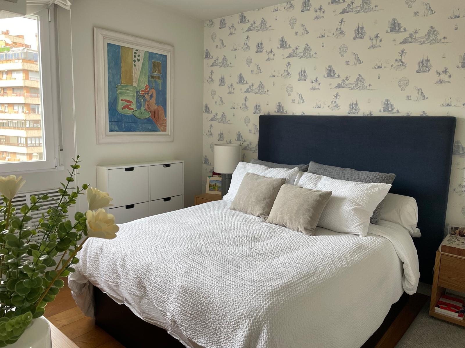 Se mantuvo el papel y el cabecero de la pared, y se añadieron alfombras a ambos lados de la cama, un zapatero y cuadros familiares.
