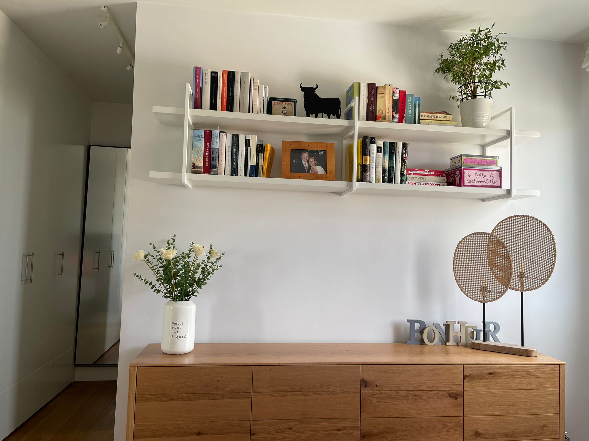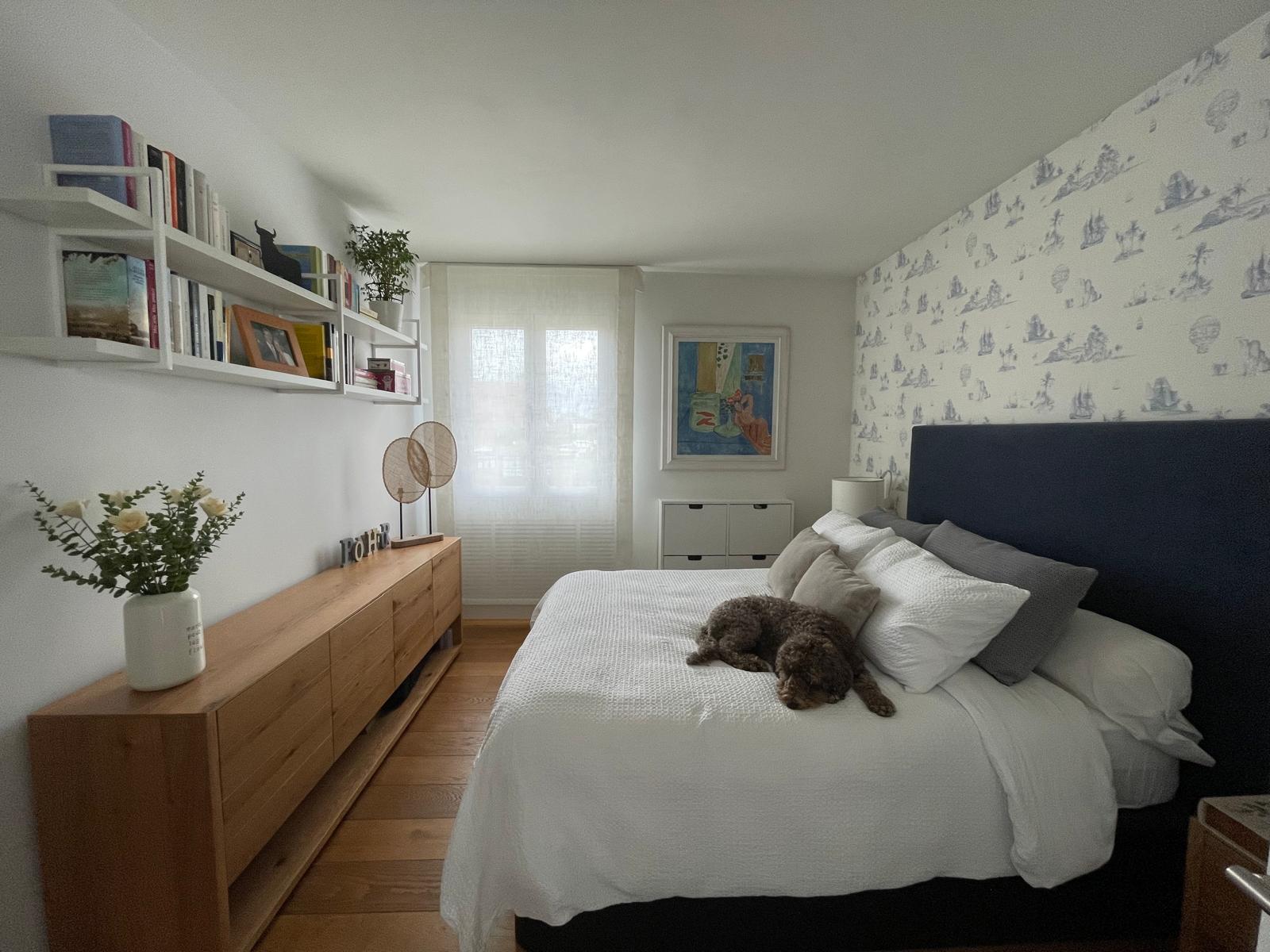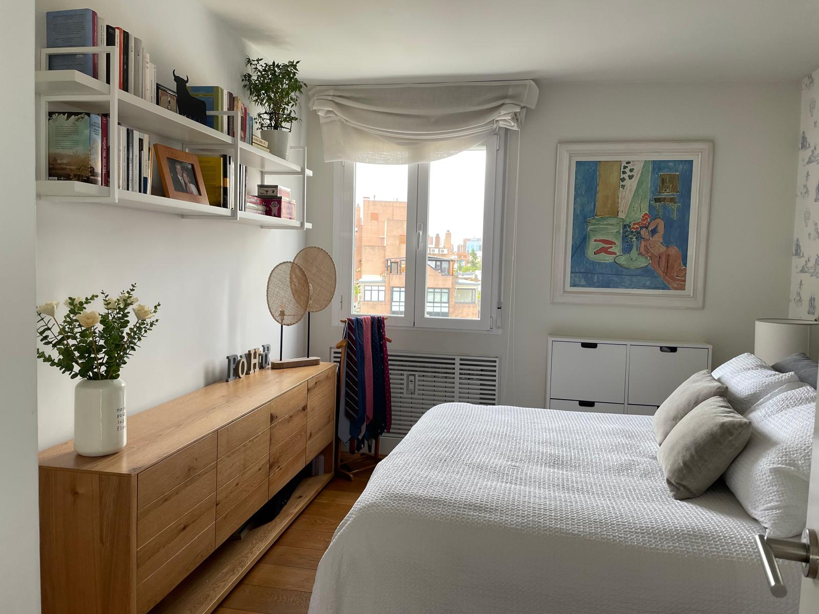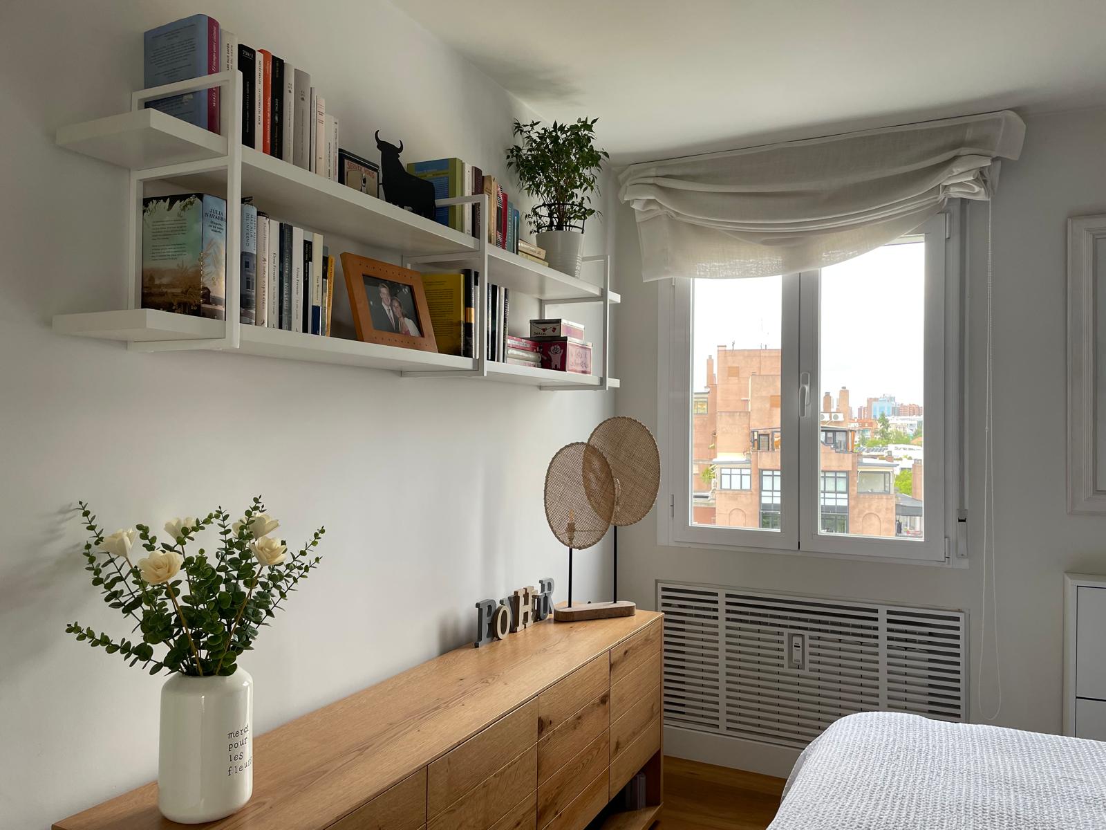 En la habitación principal se planifico un soporte al vestidor, un aparador con toques cálidos de madera complementado con más baldas blancas para recuerdos y libros y dejando un espacio intermedio para una televisión en el futuro.